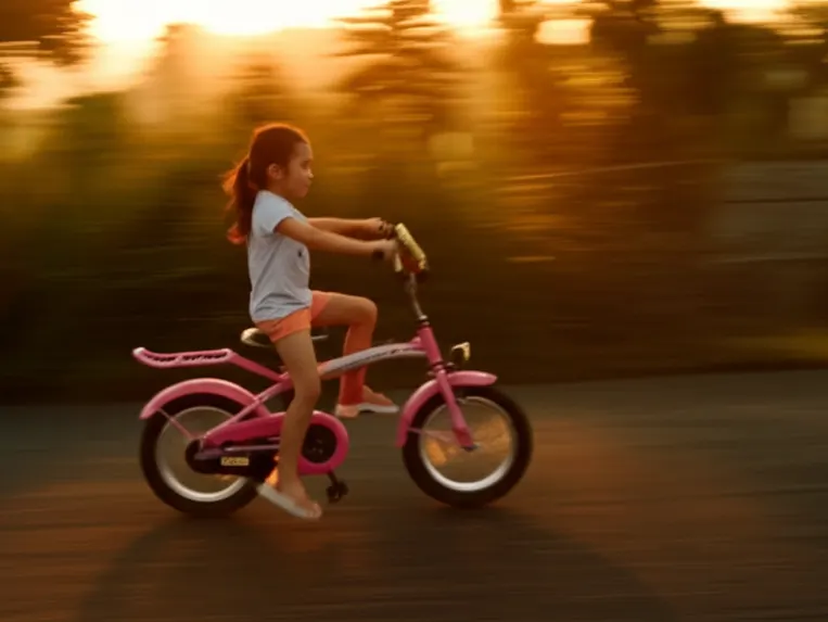 “Buat video sinematik 6 detik tentang anak naik sepeda listrik pink di sore hari, kamera bergerak dari kanan ke kiri, suasana Bali, cahaya matahari senja.”